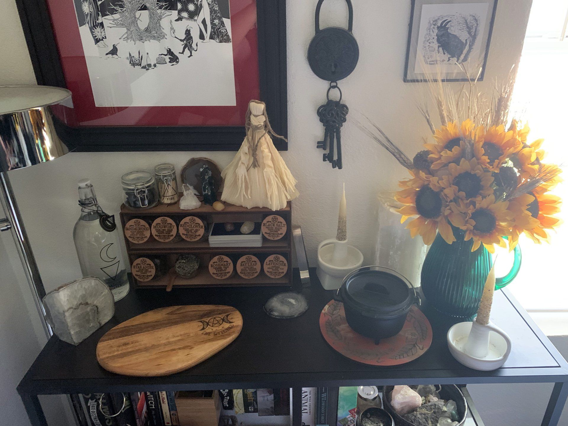 I just wanted to give everyone a peek at my Lughnasadh altar setup and talk a little about a few of the items on it (including some new items that will be listed in the shop soon). It was important to me to choose flowers and bread intentionally based on what can be harvested in my area during this time of year.