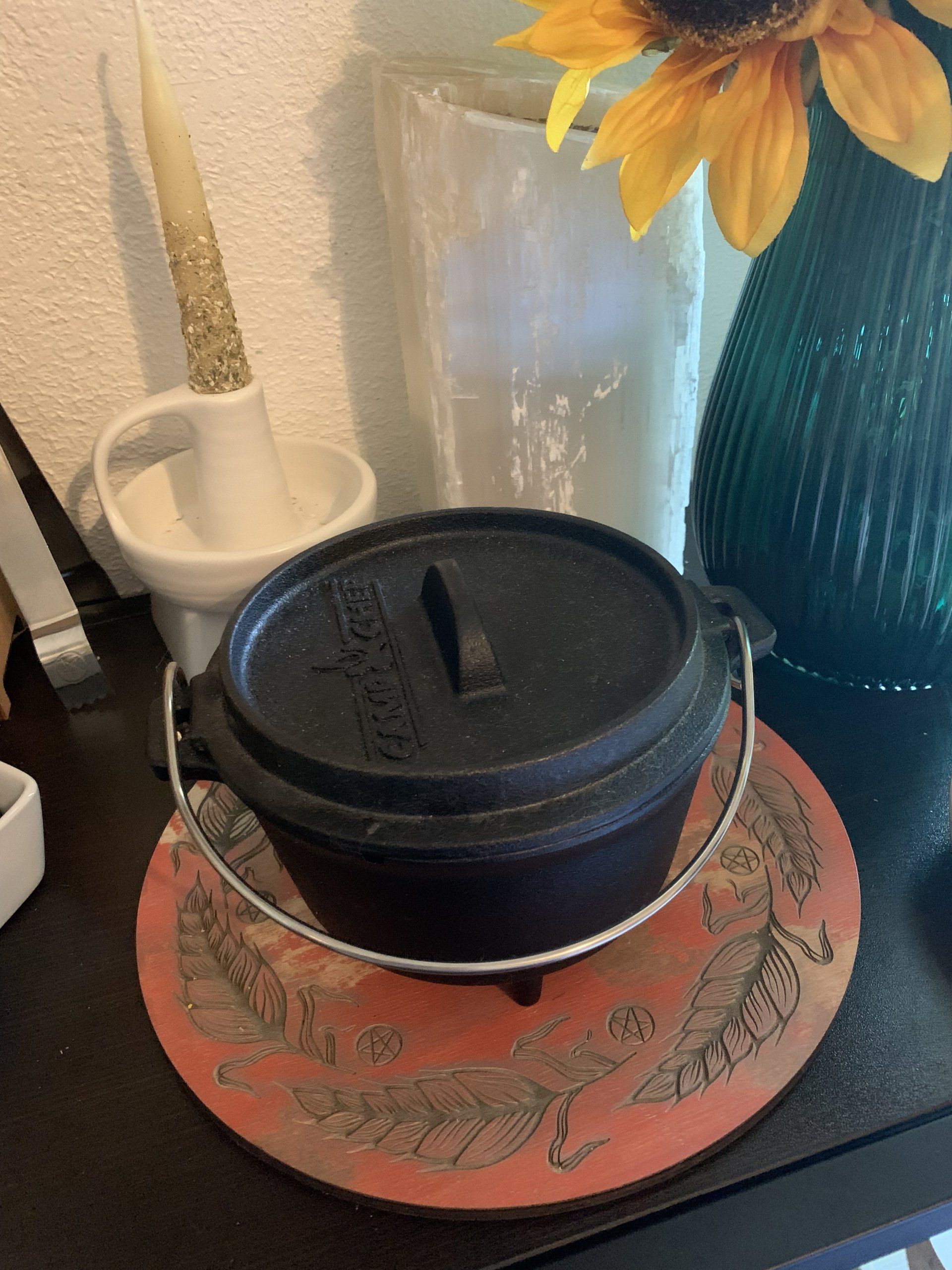 I'd like to preface this by saying that I don't really use altar cloths much. We live in a house that is over 100 years old and it just gets dusty to quick for me. I prefer to be able to wipe down my altar when it gets dusty instead of having to wash a cloth. I tend to opt for a small altar board under my cauldron to protect the surface of my shelf. This altar board I specifically designed for the harvest festivals and features hand drawn sheafs of wheat and small pentacles with chippy orange paint.
